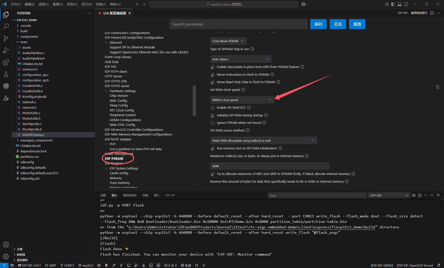 idf同时配置的“FLASH 模式”与“PSRAM 模式”组合120MHz
